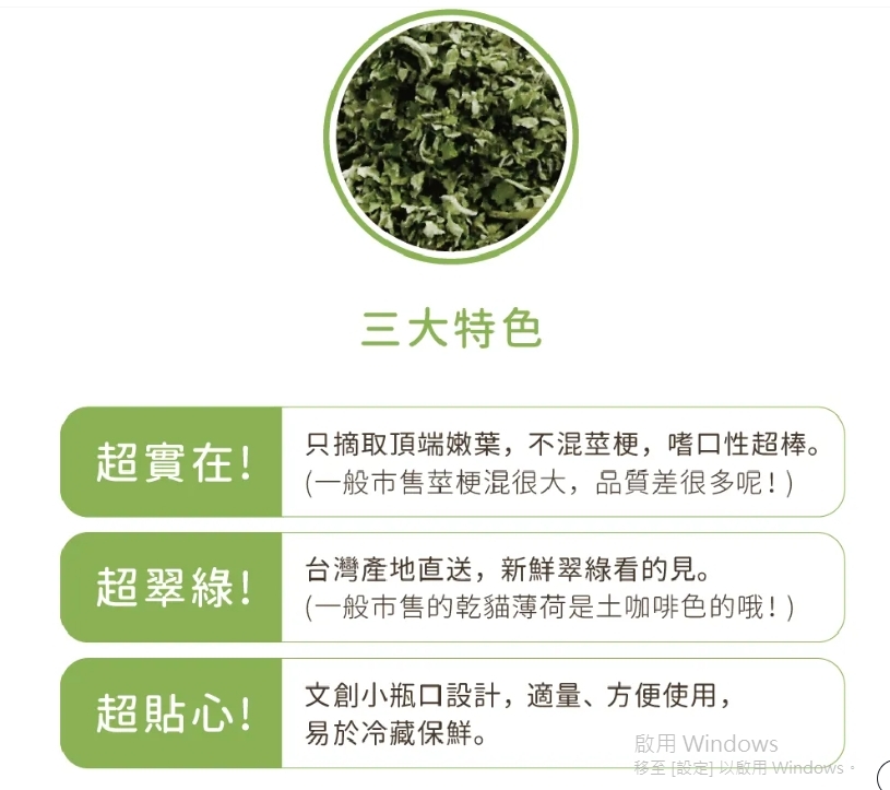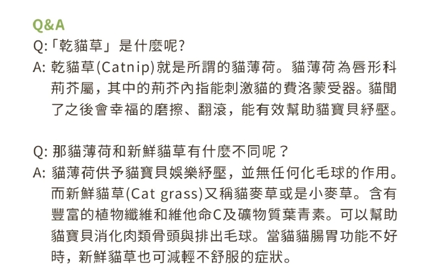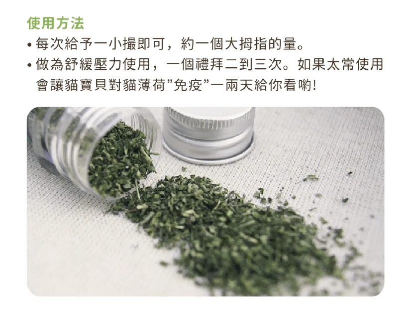 • 貓薄荷是貓寶貝們最愛的零食之一,每次給予一小撮即可,約一個大拇指的量。