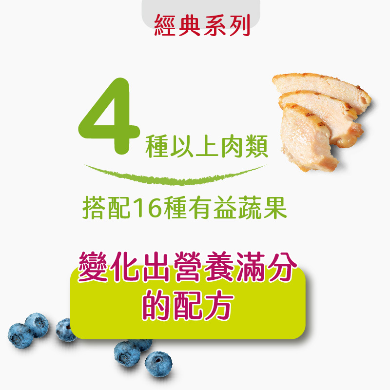 天然食材 提供 12 種關鍵營養素,並使用鮮肉為第一主要成分