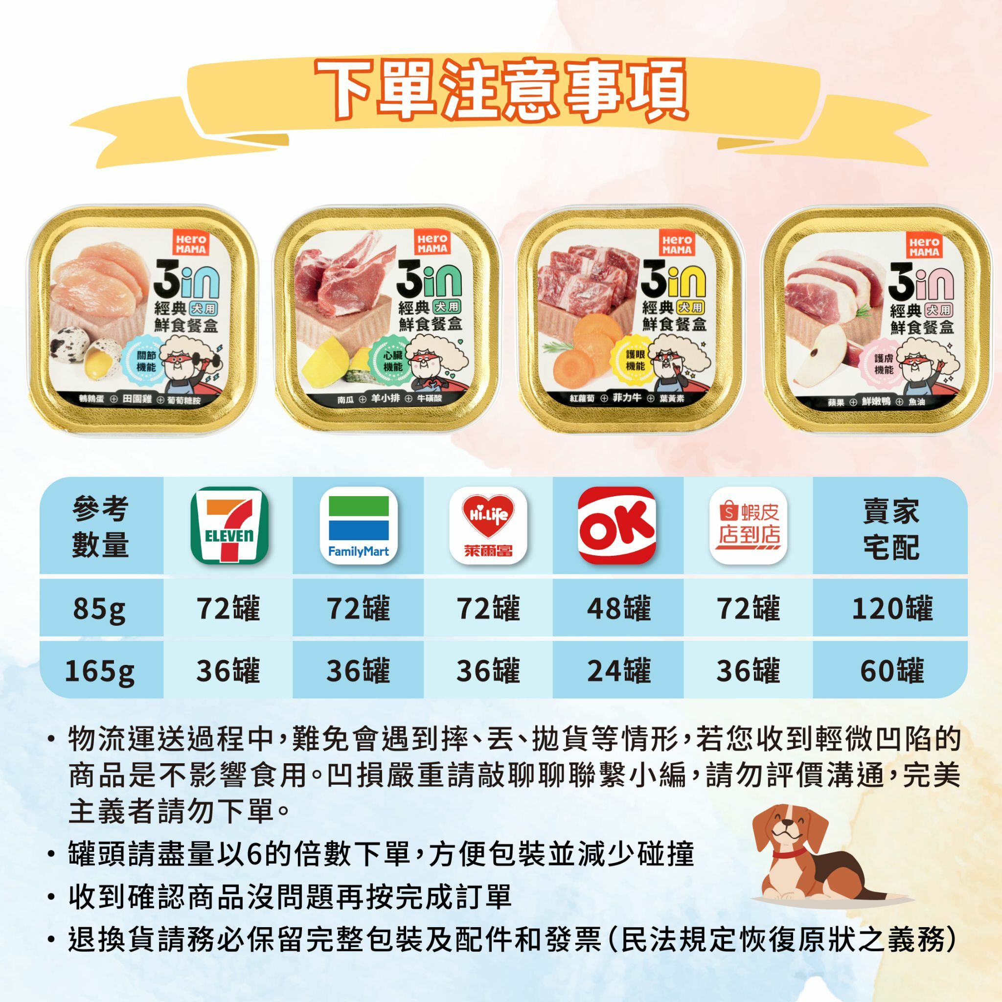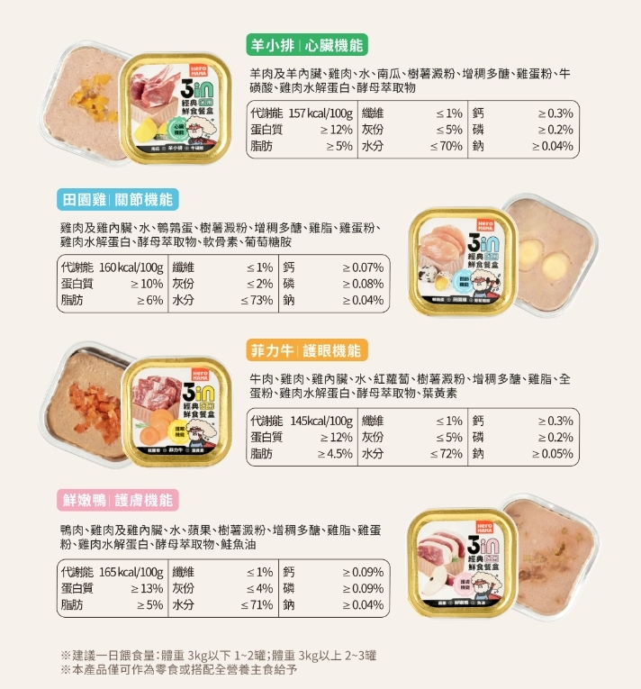餵食建議:體重3kg以下1~2罐;體重3kg以上2~3罐。僅可做為零食或搭配全營養主食給予。