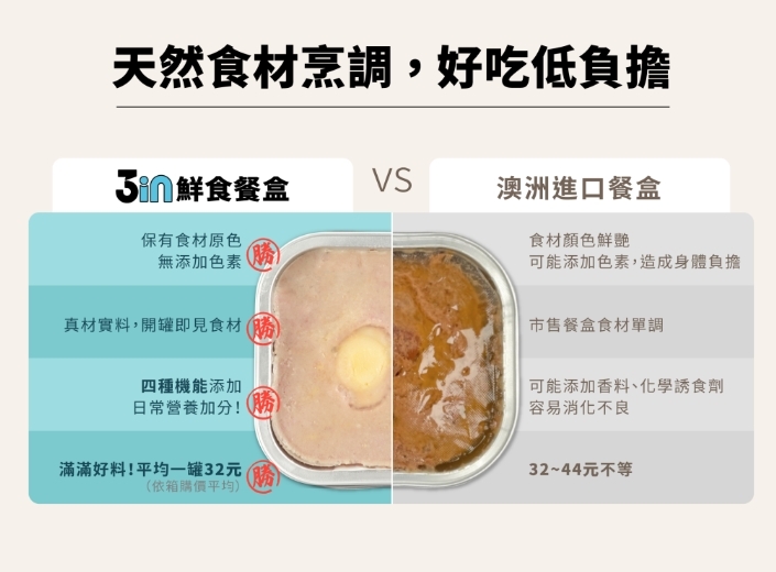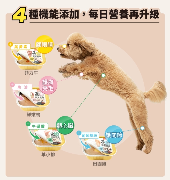☑ 4種機能添加 (葉黃素、魚油、牛磺酸、葡萄糖胺),每日營養再升級