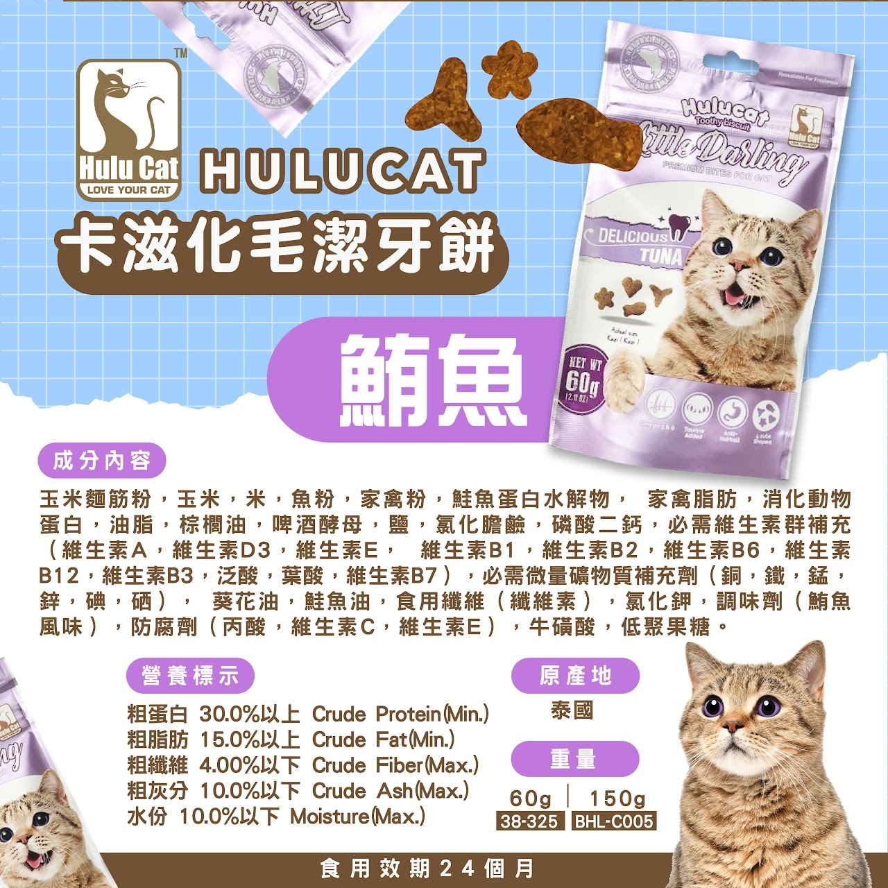 💜鮪魚:玉米麵筋粉、玉米、米、魚粉、家禽粉、鮭魚蛋白水解物、家禽脂肪、消化動物蛋白、油脂、棕櫚油、啤酒酵母、鹽、氯化膽鹼、磷酸二鈣、必需維生素群補充(維生素A、維生素D3、維生素E、維生素B1、維生素B2、維生素B6、維生素B12、維生素B3、泛酸、葉酸、維生素B7)、必需微量礦物質補充劑(銅、鐵、錳、鋅、碘、硒)、葵花油、鮭魚油、食用纖維(纖維素)、氯化鉀、調味劑(鮪魚風味)、防腐劑(丙酸、維生素C、維生素E)、牛磺酸、低聚果糖。