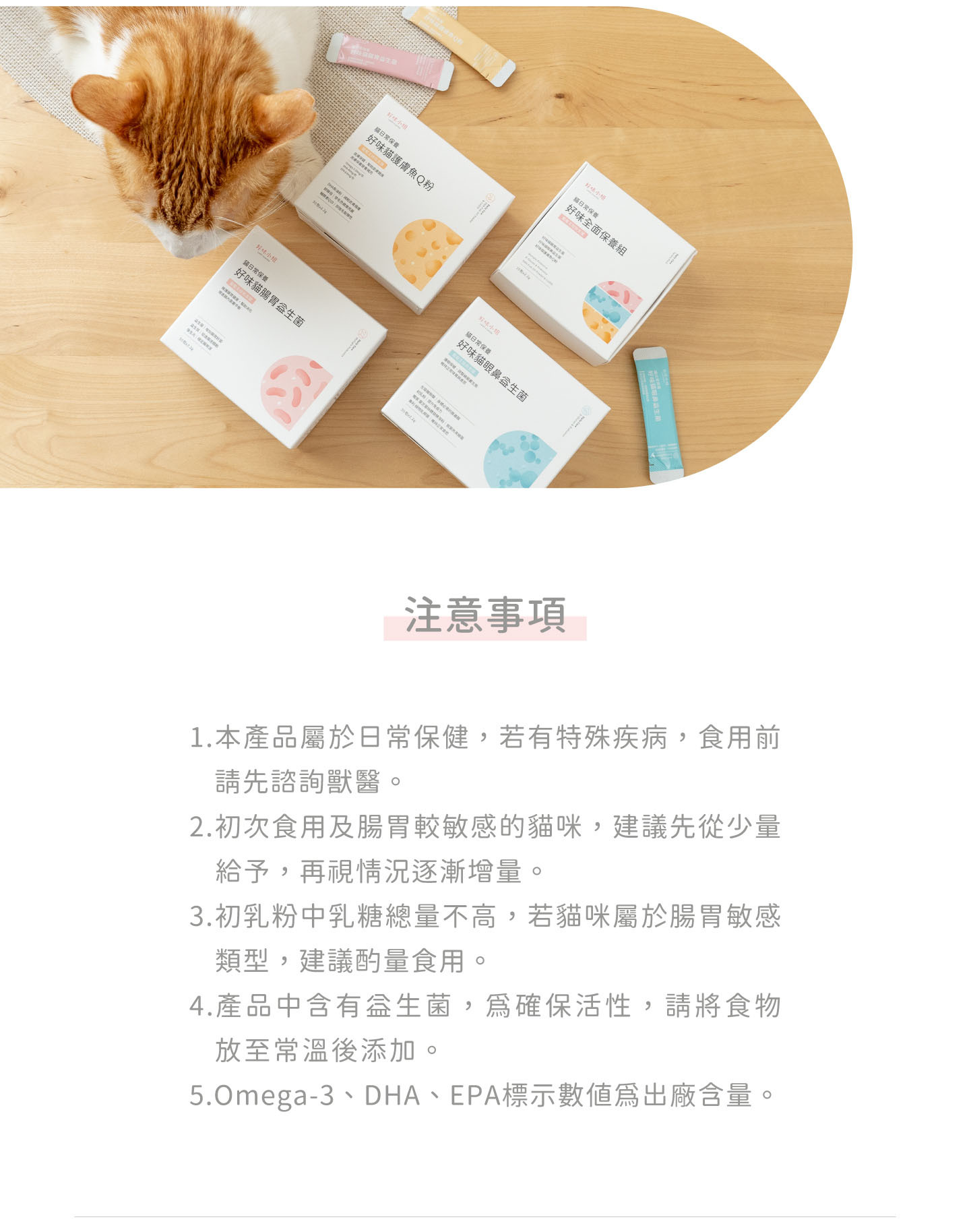 3.初乳粉中乳糖總量不高,若貓咪屬於腸胃敏感類型,建議酌量食用。