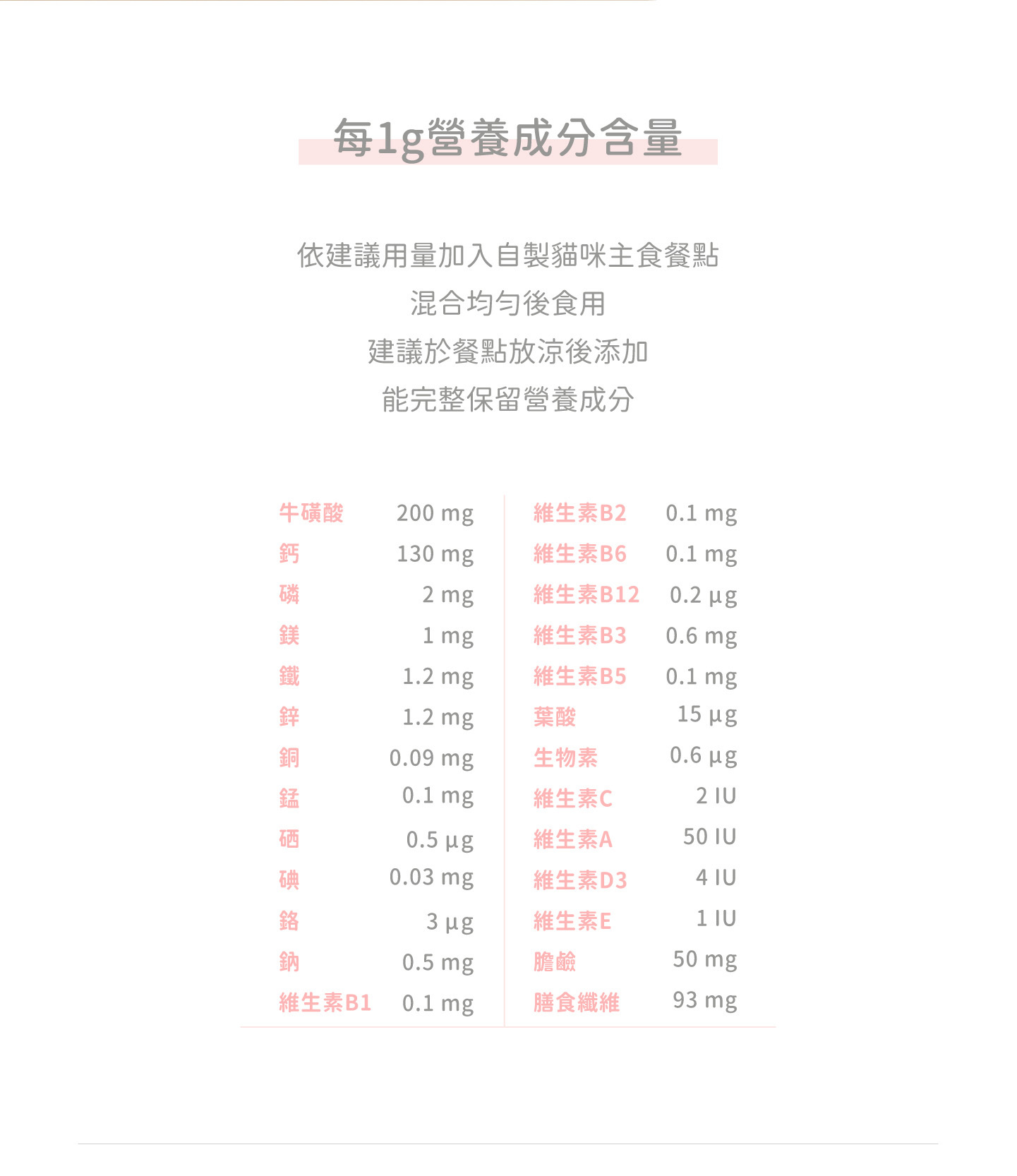 依建議用量加入自製貓咪主食餐點,混合均勻後使用(建議放涼後再添加,能完整保留營養成分)