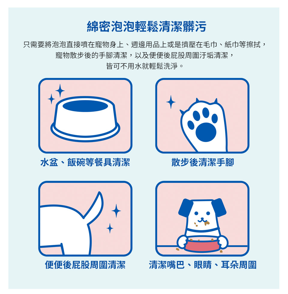 ☑ 泡泡直接噴在寵物身上或週邊用品上,或擠壓在毛巾或紙巾上擦拭即可。