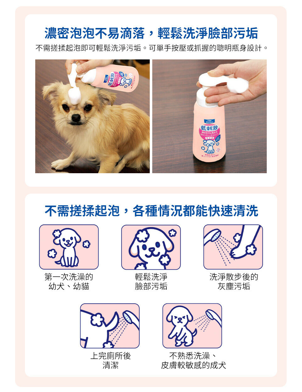 ☑ 泡泡款易沖洗因此適合給還不習慣洗澡的幼犬貓使用。
