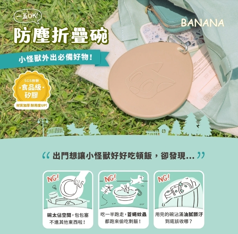 A:怪獸折疊碗的蓋子為防塵用途,並非完全密封,請小心不要裝滿流動性高的泥狀或液狀食物趴趴走唷!