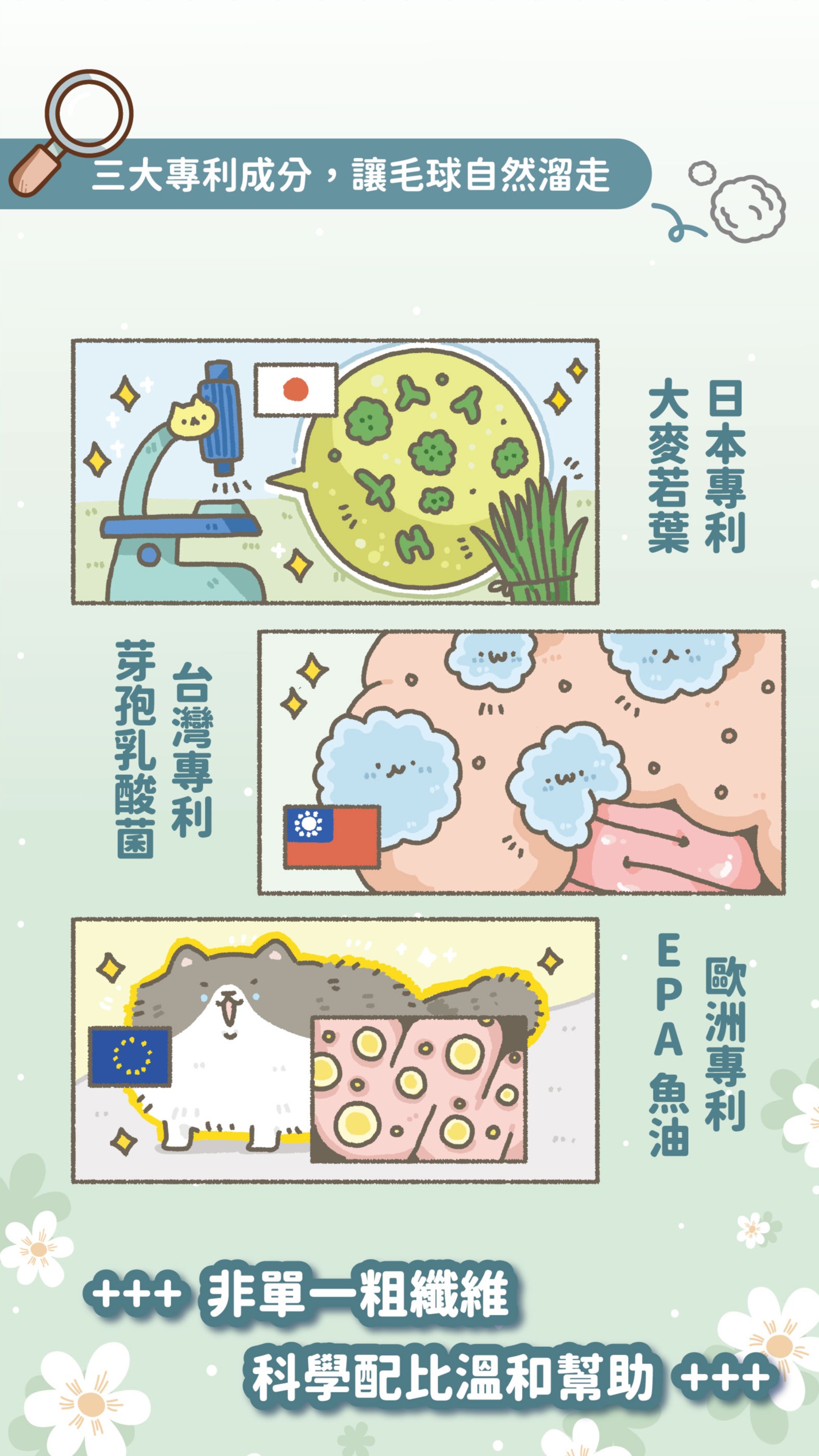 ☑︎ 保護腸胃,嚴選【台灣專利芽孢型乳酸菌】,幫助貓貓在化毛同時,兼顧腸胃機能健康