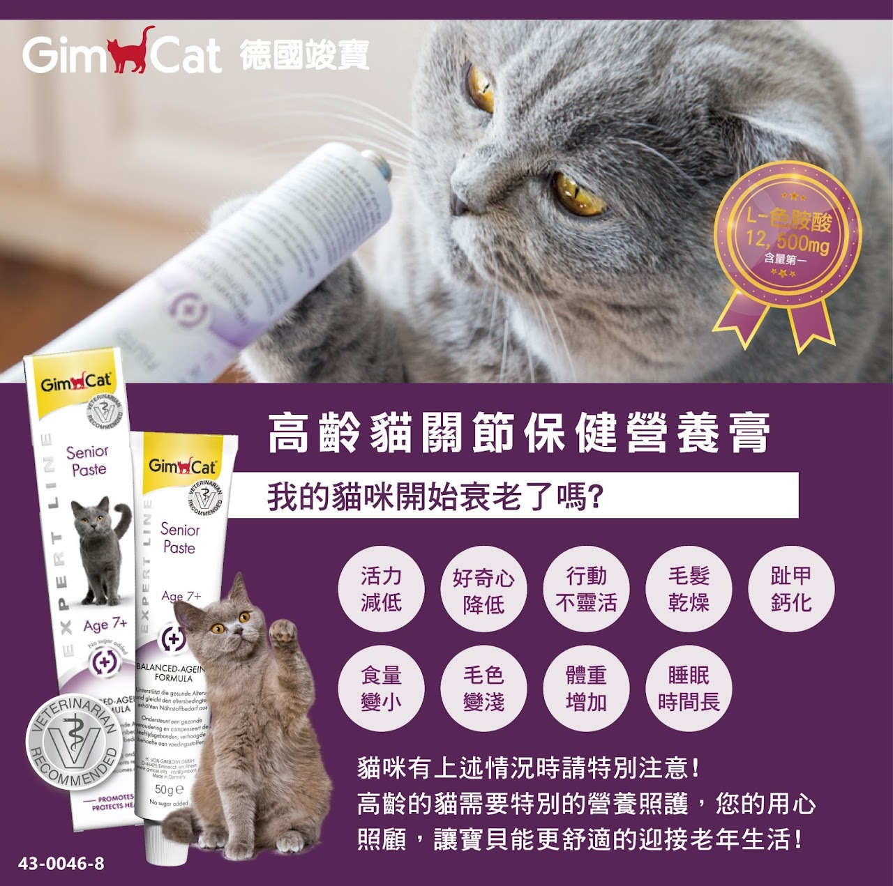 7歲以上、關節退化適用,與人類或狗相比,貓的老化跡象不太明顯,但7歲以上的高齡貓代謝過程開始有變化,且會有越來越多與年齡有關的問題產生,包括體重不足等。