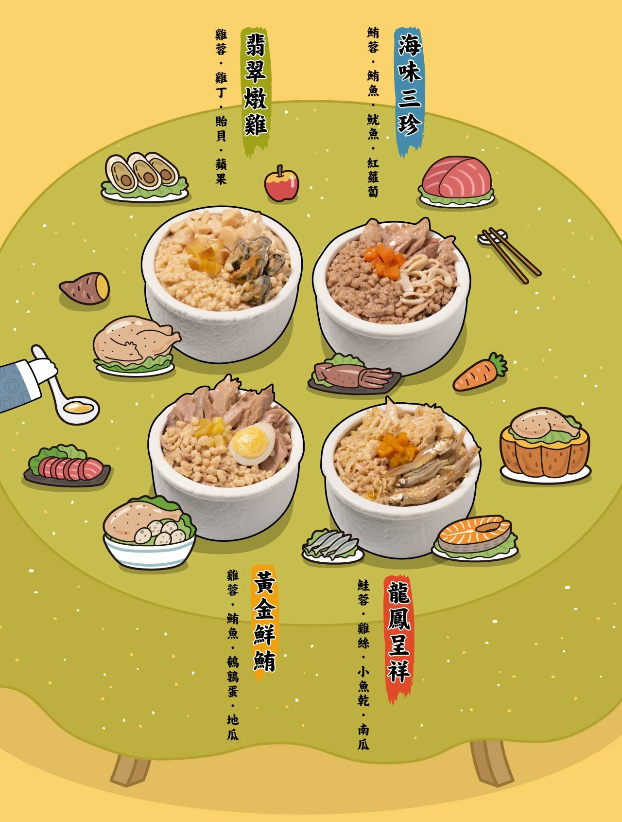 口味:翡翠燉雞/龍鳳呈祥/海味三珍/黃金鮮鮪