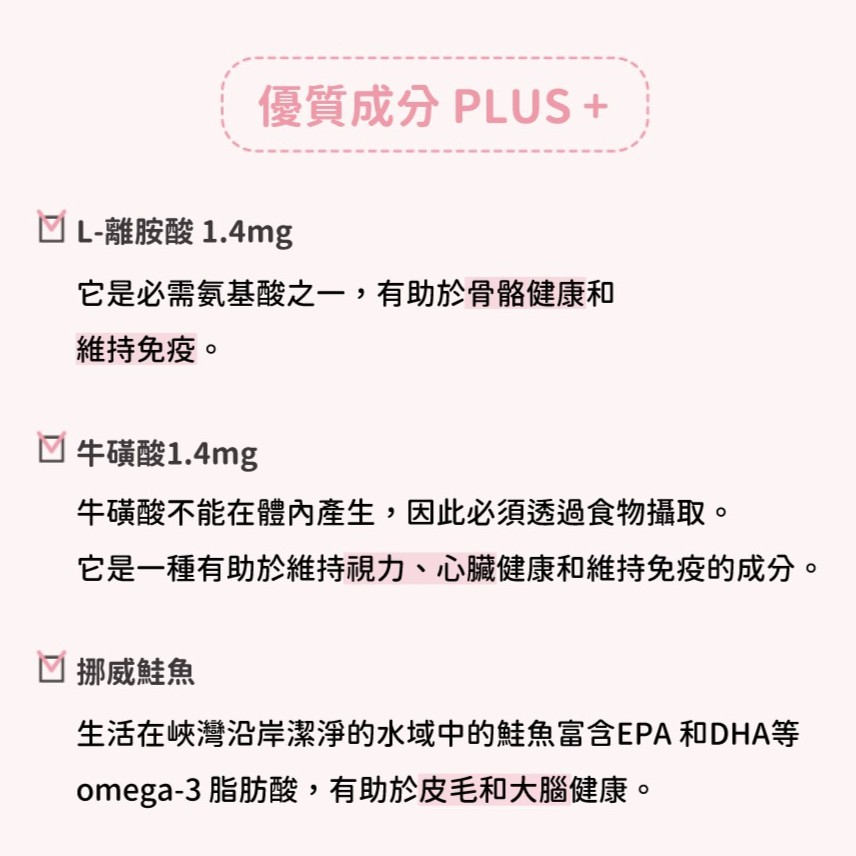 ☑ 含有1.4mg 牛磺酸、離胺酸