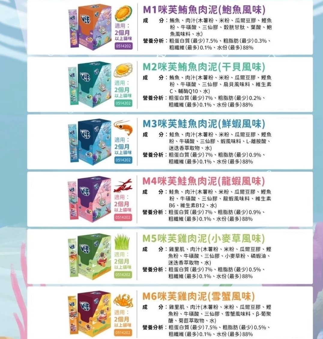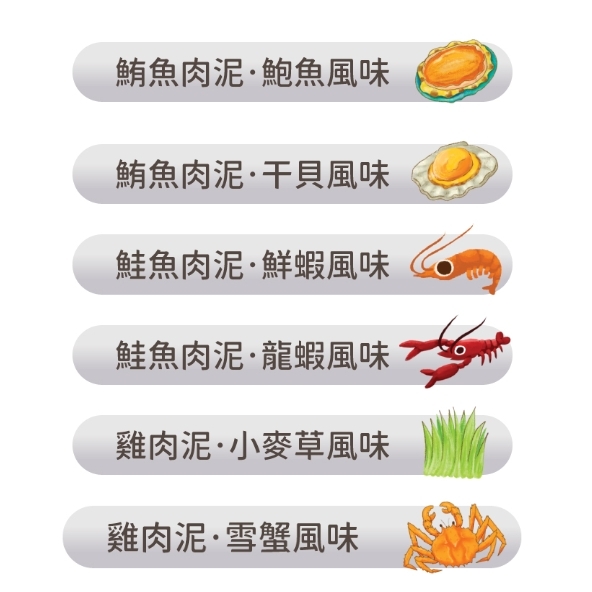 ☑ 六種特選口味,天天勾引貓咪味蕾☑ 每款添加不同保健成分 (牛磺酸、葉酸、葡聚醣、維生素B、維生素C、磷蝦油、離胺酸)