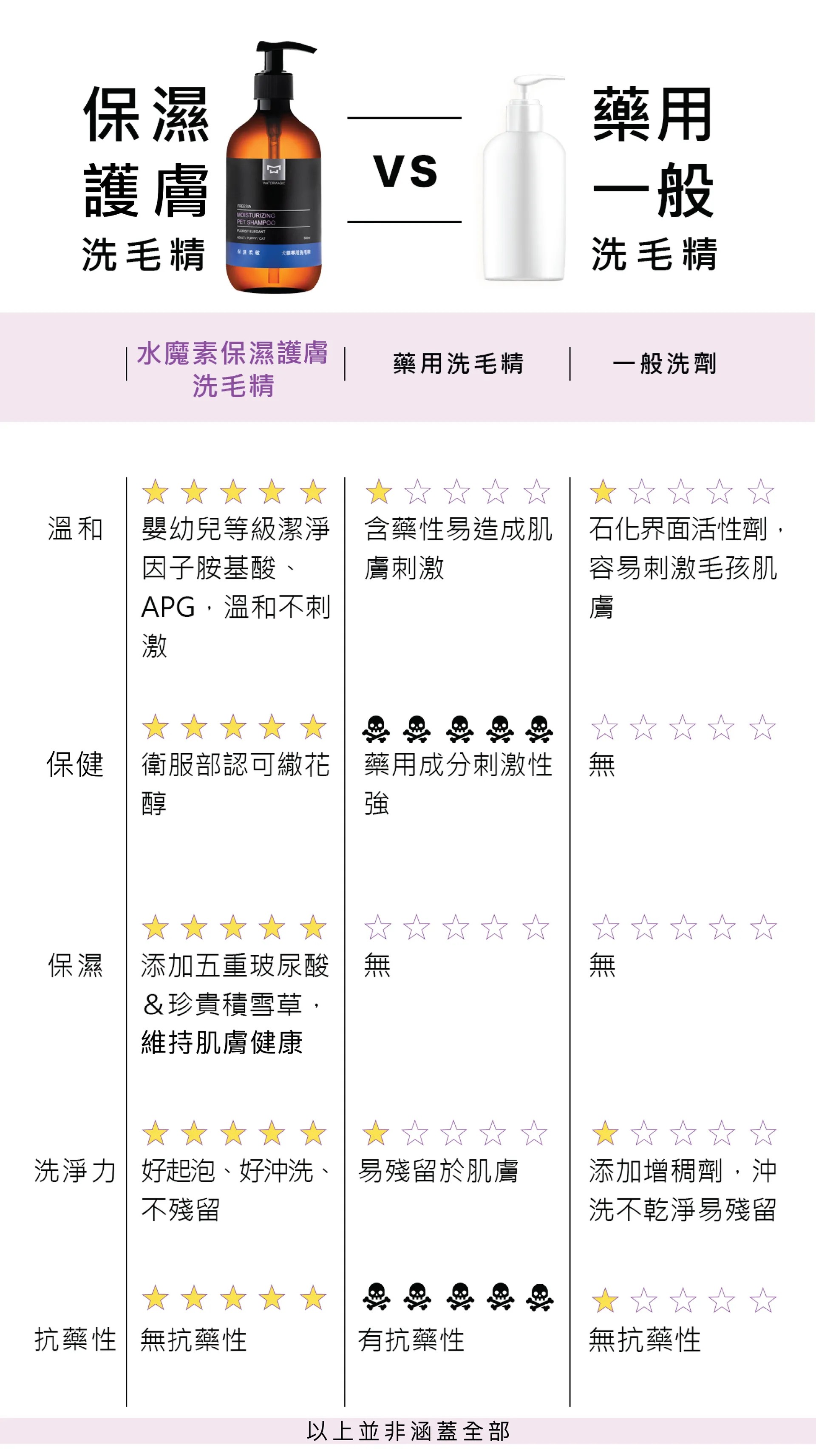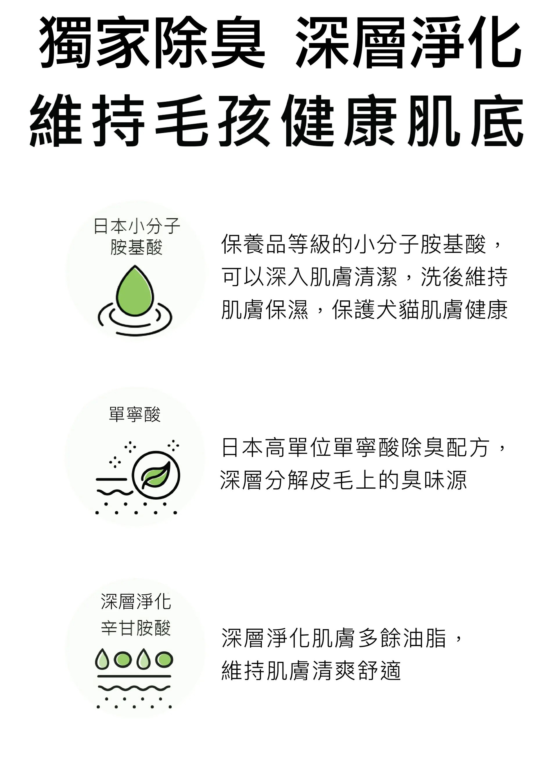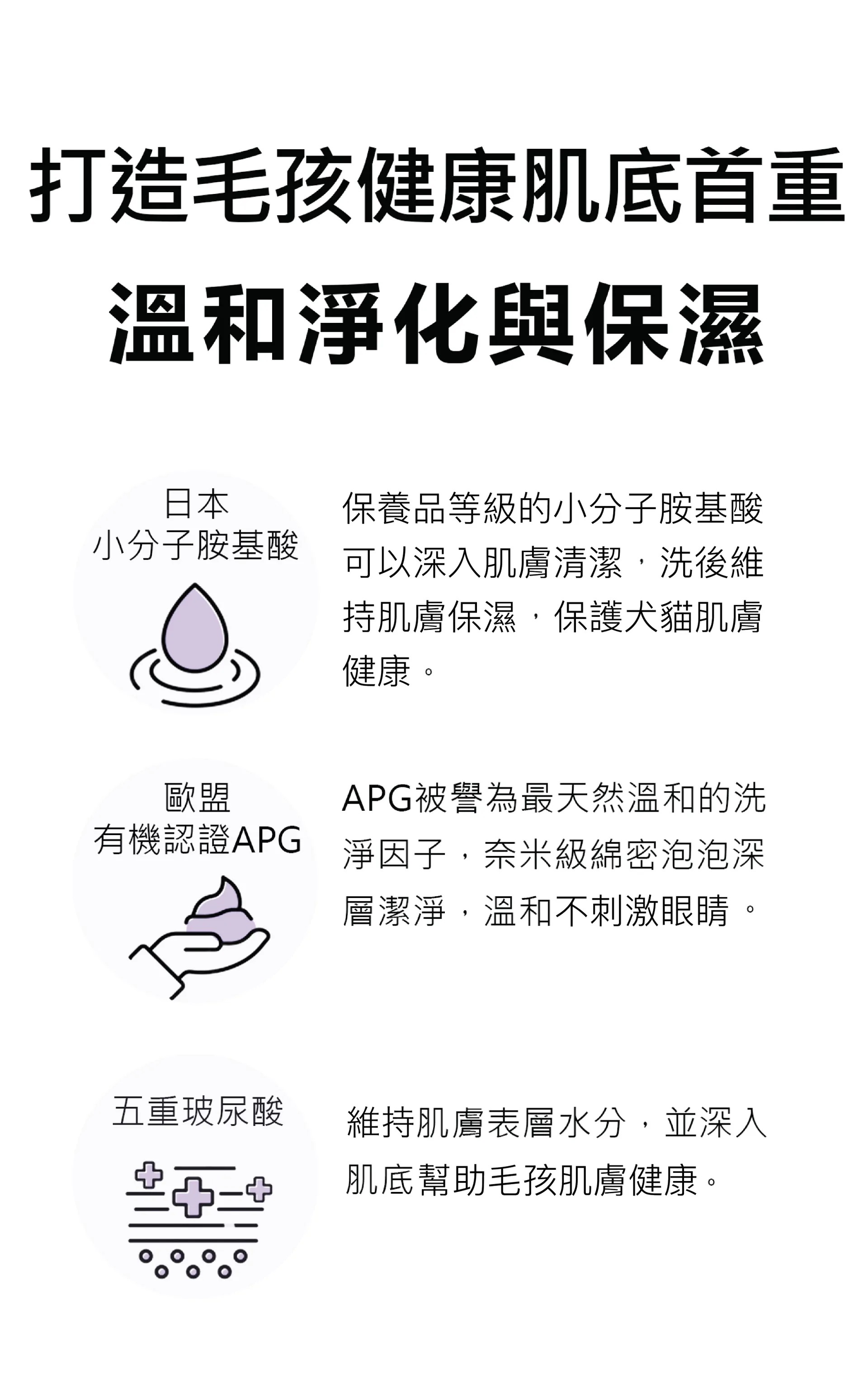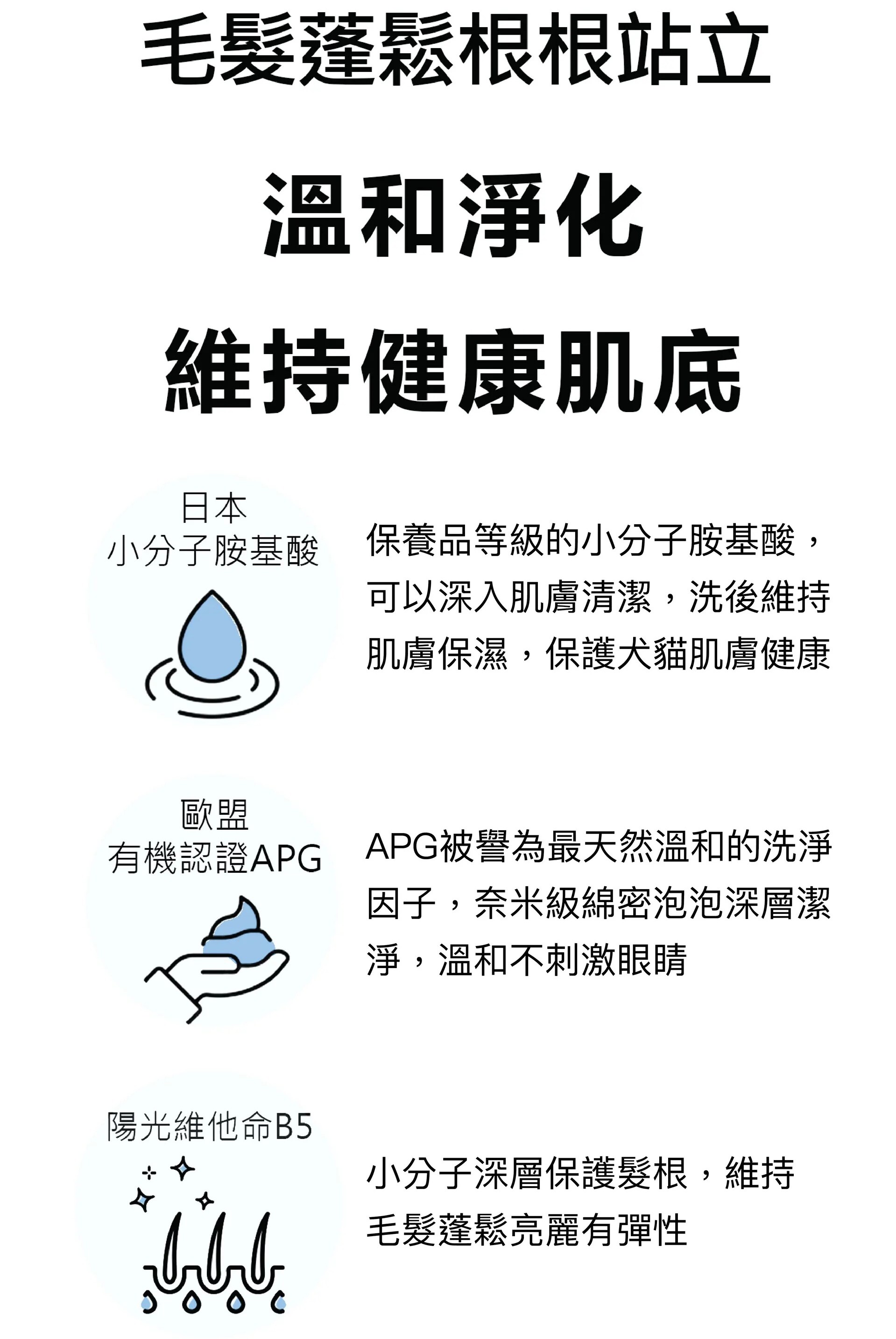 ☑ 不計成本添加天然溫和洗淨胺基酸因子,不需要再使用護毛乳(避免護毛乳堵塞肌膚出油更嚴重)