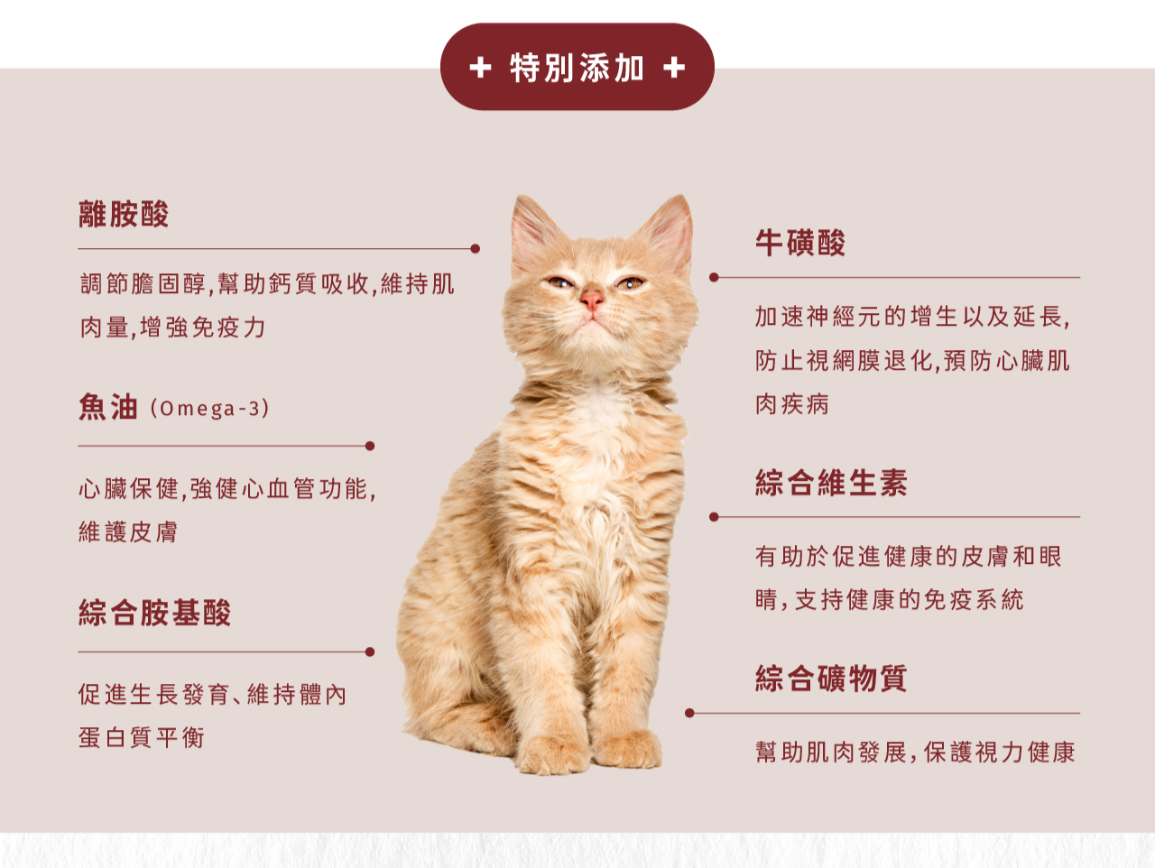 ☑ 特別添加離胺酸、牛磺酸、綜合維生素、綜合礦物質