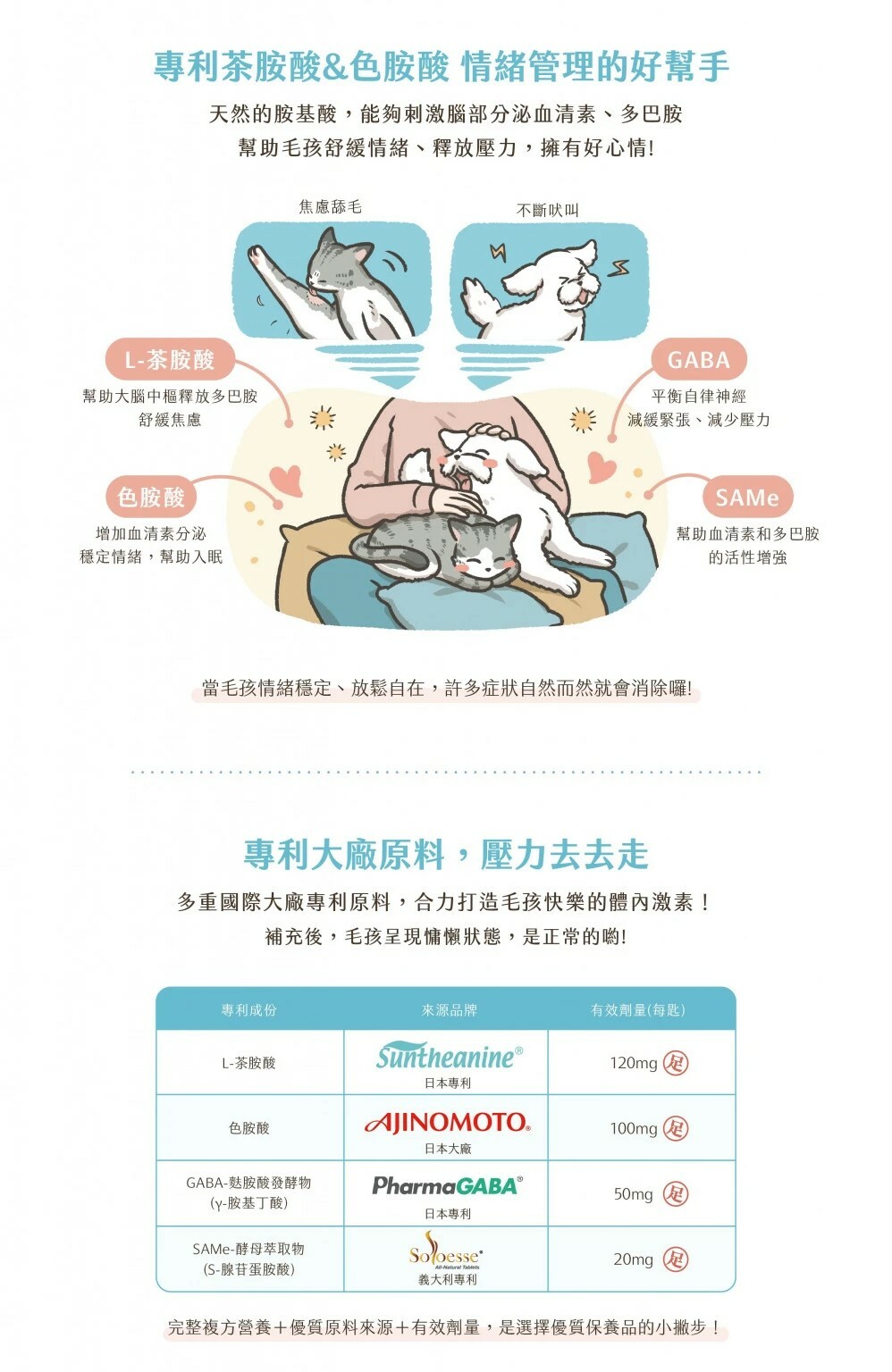 • 嚴選國際專利成分與複方設計,透過天然胺基酸,幫助毛孩減少壓力!