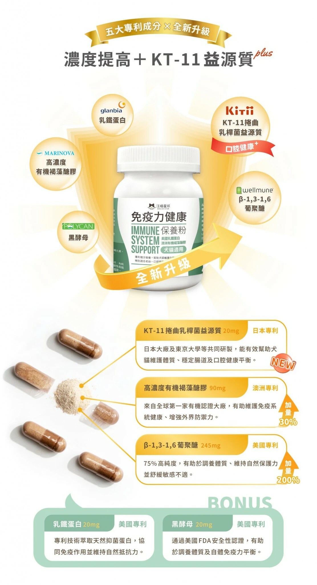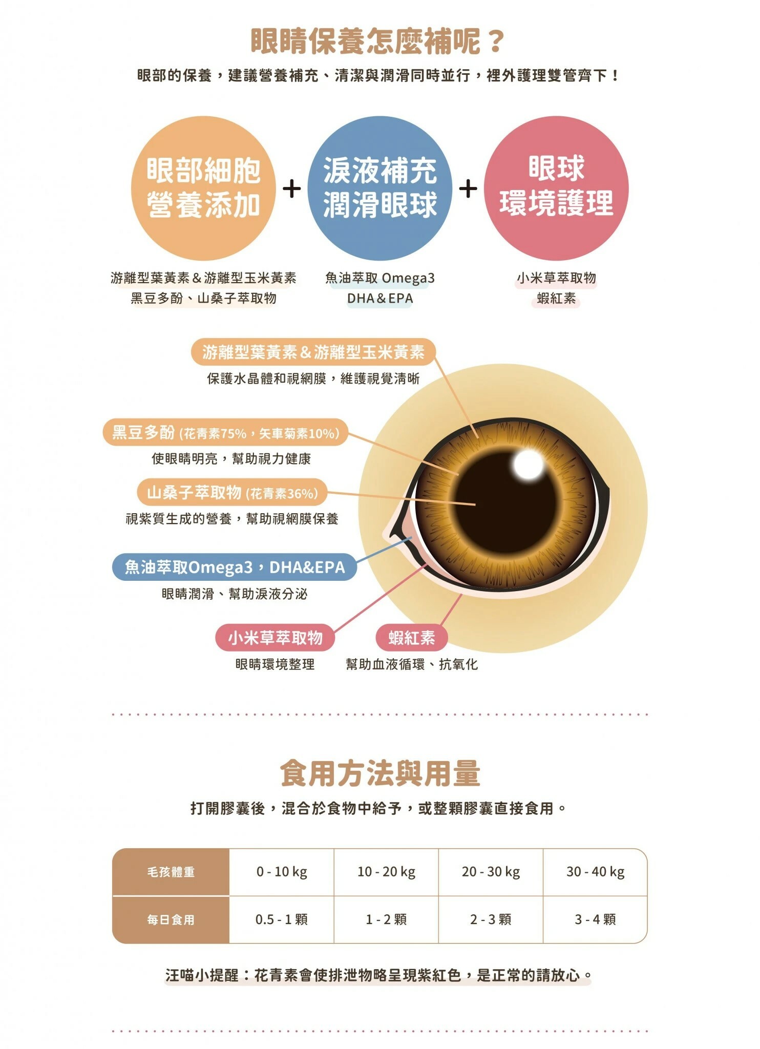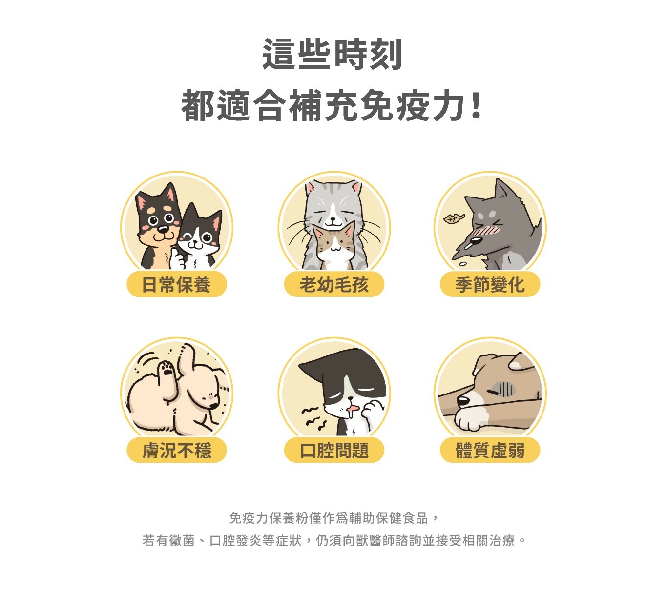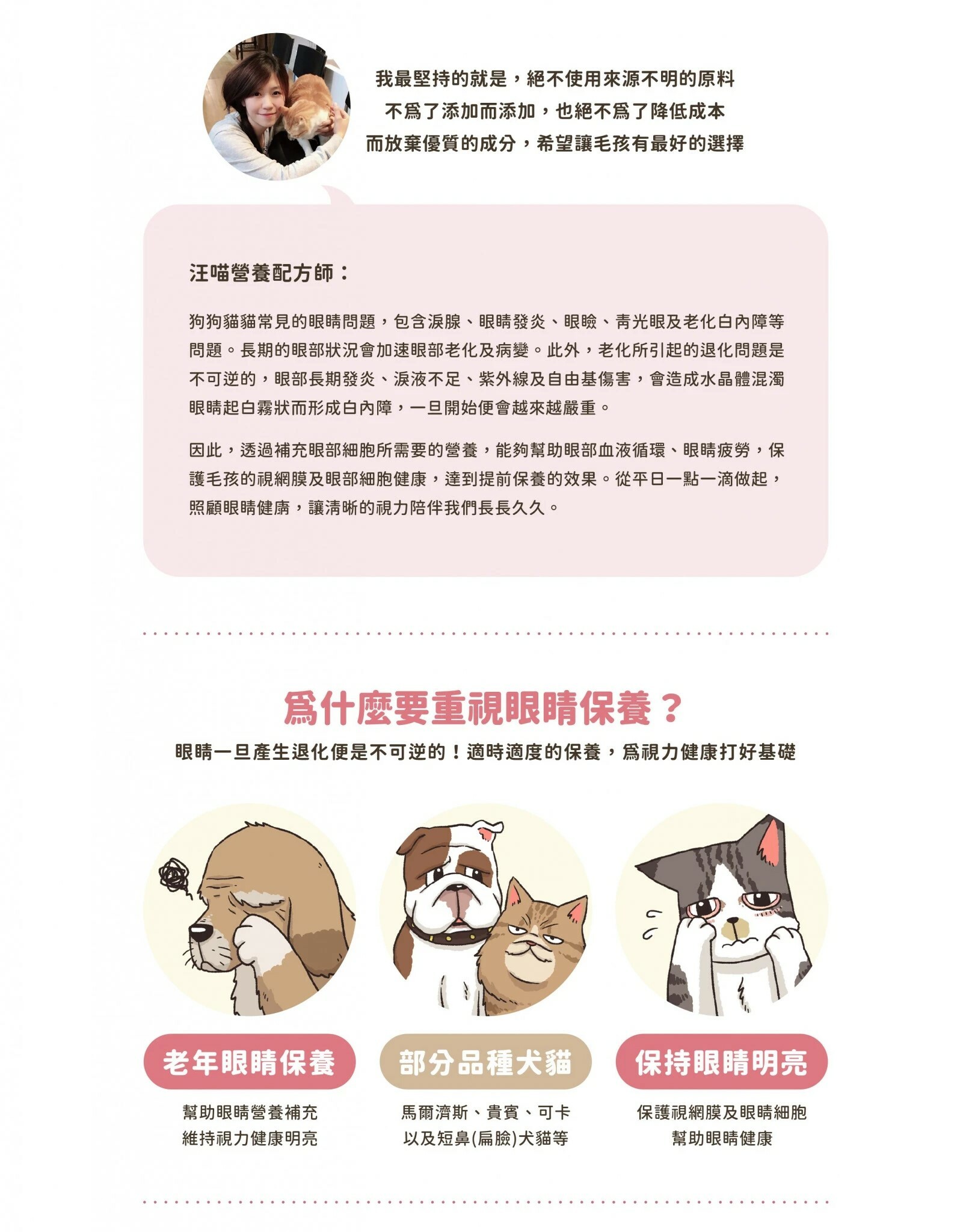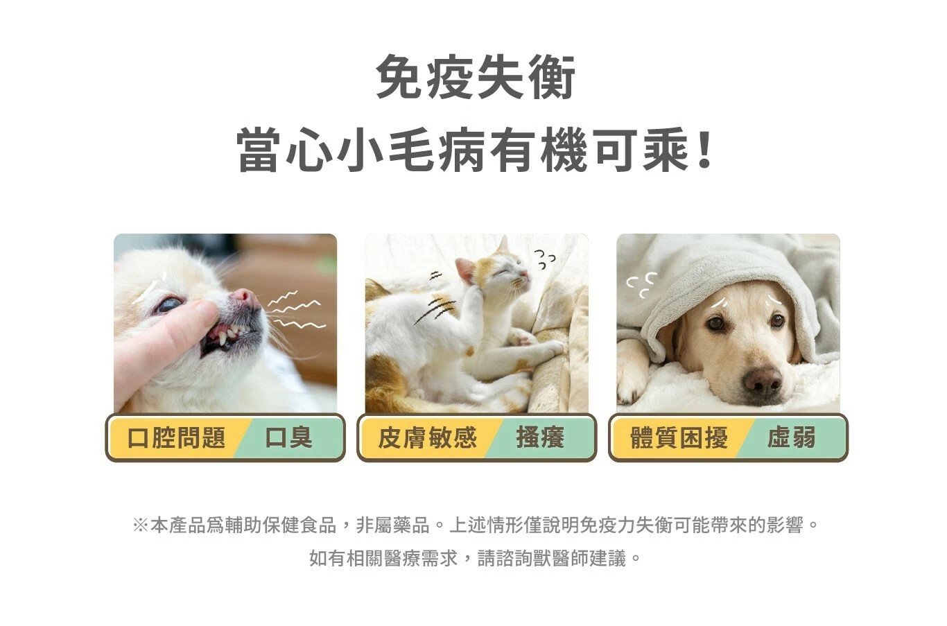 • 犬貓皆適用,特別建議中年期開始(狗狗約7歲起)及特殊品種犬貓每日保養