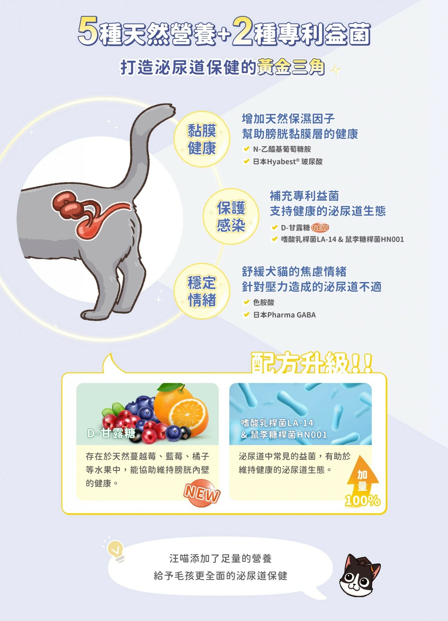 • 嚴選國際專利複方,從情緒壓力、泌尿道生態、黏膜健康到排尿機能,全面支持泌尿道健康