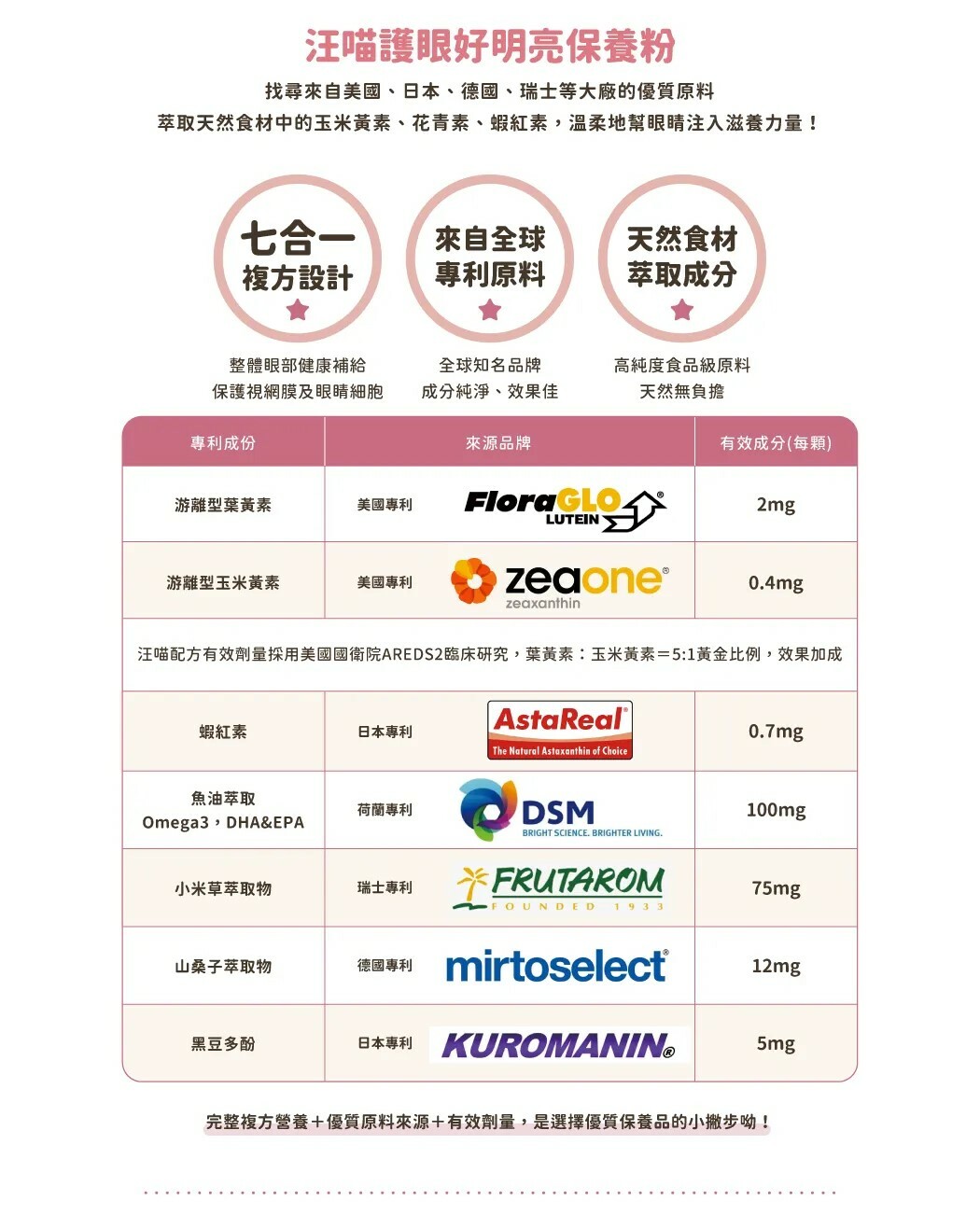 • 美國第一大廠葉黃素&日本專利蝦紅素使用