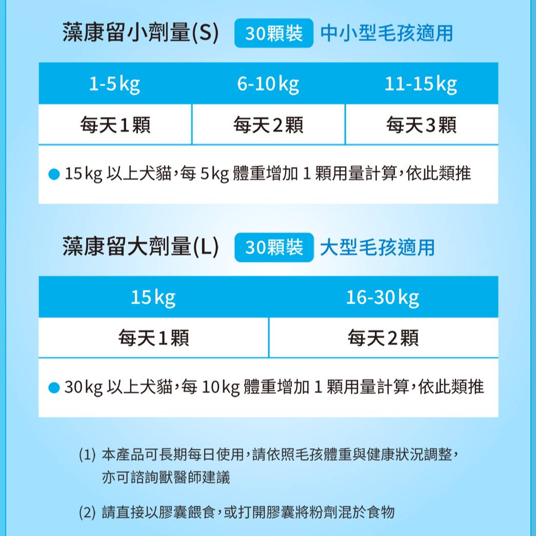 小劑量-每顆310mg±10% (含膠囊重60mg),粗脂肪5.1%、粗蛋白20.4%、粗纖維7.7%、灰分6.8%、水分7.6%;