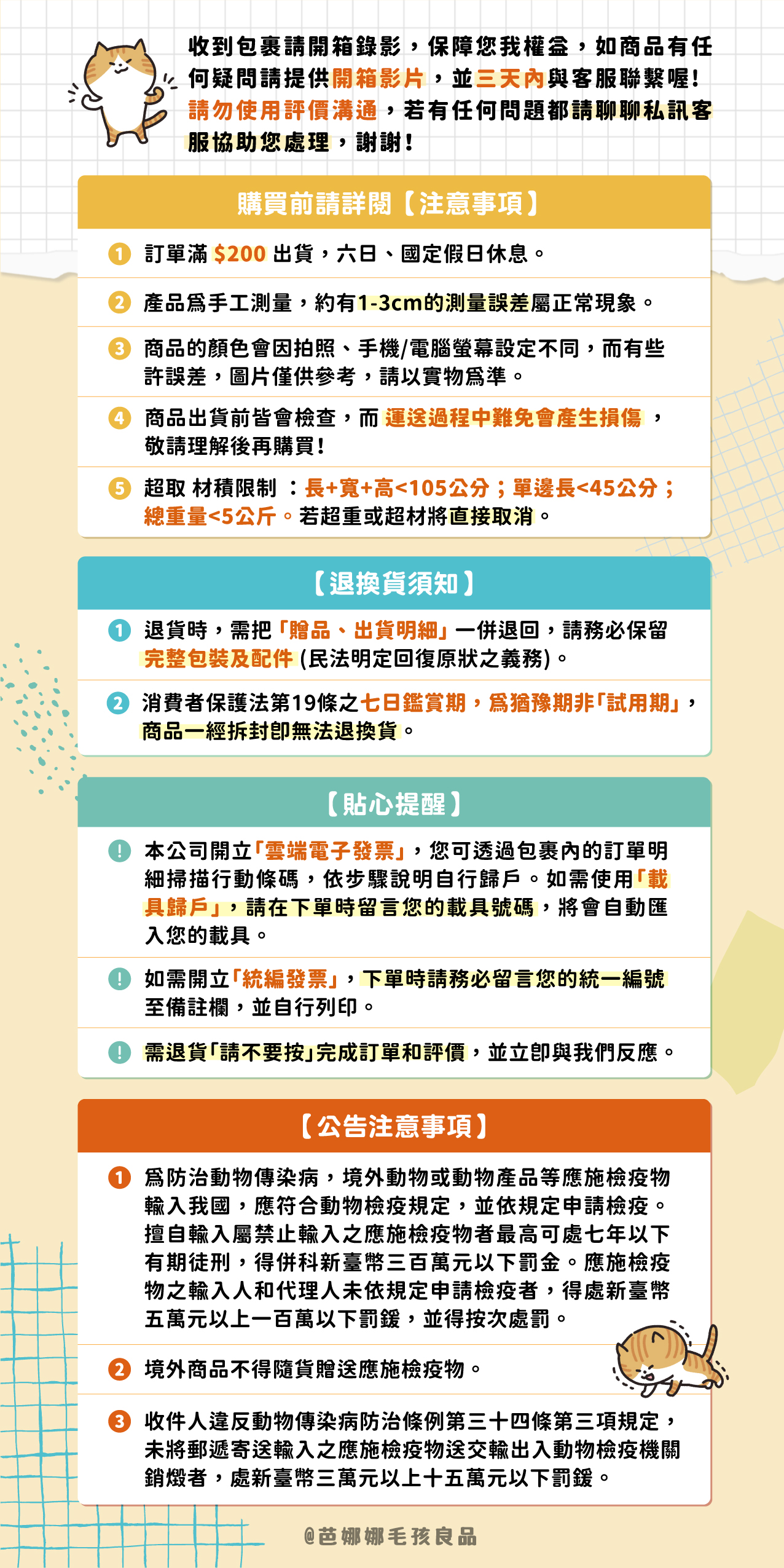 芭娜娜毛孩良品不會以任何名義向您索取或核對任何金融帳戶、信用卡,也絕不會主動要求您於ATM進行任何金融上的操作行為,若遇可疑電話請勿理會,如有疑慮請私訊芭娜娜毛孩良品的LINE或撥打165反詐騙專線查證!